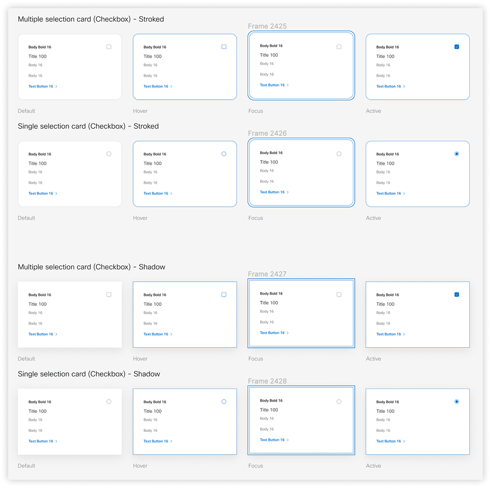 Selectable Card enhancement — redesigned interaction model with full state coverage and WCAG AA compliance.